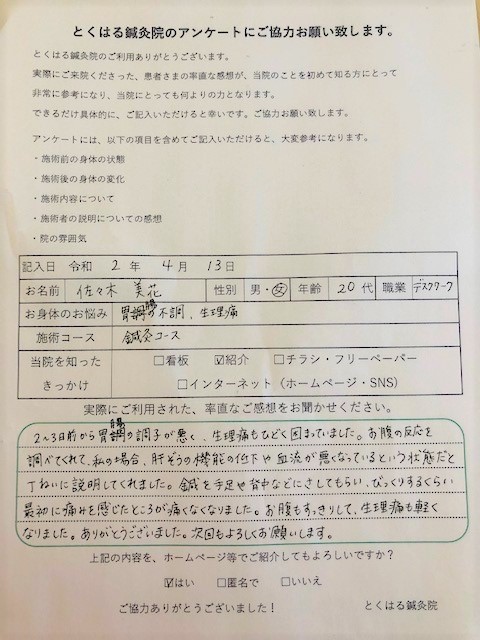 2~3日前から胃腸の調子が悪く、生理痛もひどく困っていました。お腹の反応を調べてくれて、私の場合肝臓の機能の低下や血流が悪くなっている状態だと丁寧に説明してくれました。鍼を手足や背中などに刺してもらい、びっくりするくらい最初に痛みを感じたところが痛くなくなりました。お腹もスッキリして、生理痛も軽くなりました。ありがとうございました。次回もよろしくお願いします。