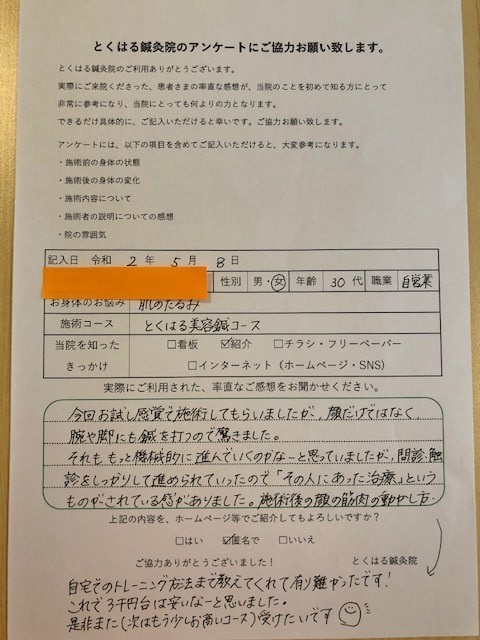 それも、もっと機械的に進んでいくのかなーと思っていましたが、問診、触診をしっかりして進められていったので「その人にあった治療」というものがされている感がありました。施術後の顔の筋肉の動かし方、自宅でのトレーニング方法まで教えてくれて有り難かったです!